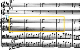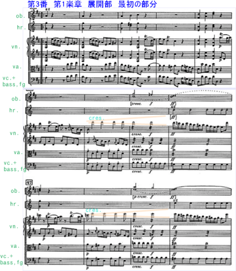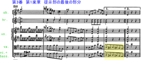 第1楽章の冒頭から、主題と4分音符対旋律が印象的。提示部の最後の部分で、低弦が