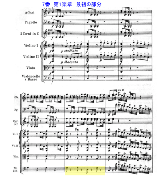 No.7は自筆楽譜がある。井上著 ハイドン106の交響曲を聴くにも、第1楽章の冒頭で10段の五線譜の写真がある。緩叙楽章のカデンツアの部分は、vn..とvc.の2名なので、五線譜は2段でよい。かなり長いカデンツアの部分は、五線譜のページ数を節約するために、1ページの中に詰めて書いたのかどうか? 当時は紙は貴重であったこともあり興味がある。 |