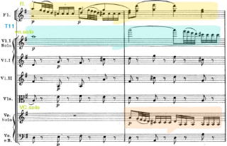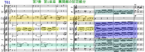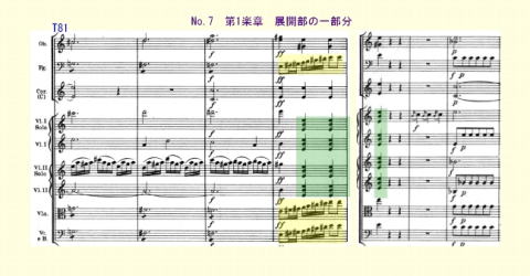 譜面のT82の箇所では弦楽器は6段になっている。Vc.とbass.は1オクターブ離れてのユニゾンなのでこの箇所の奏者は実際には7名。スコアでは2名のvn.のsoloが2つのパートに分かれている。伴奏側の2名のvn.奏者はスコアには記載はされていても、あくまで音量を落としている。伴奏側はsoloと比較して音程が低い箇所ではある。しかし音楽としては、あくまで伴奏の2名の奏者は伴奏の音色として聞こえる音楽の不思議さが、やはりある。その後T84のvn.の重音箇所も、うまく対比している雰囲気。