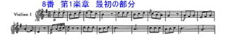 1曲ごとに交響曲の出だしは、第1主題の印象で決まると私は思うが、この簡潔な主題は分かりやすい。簡潔な3拍子単位の第1楽章の主題といえば、調性とテンポこそ違うが 同じ8分の6拍子でNo.67がある。作曲年代は1779年の頃なので、No.8からだと約18年の後になる。この2つの主題をよくみると冒頭のまとまりを含めた主題は類似しているように見える。