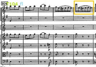 アーノンクールは古楽器だが、2つのvn.パートは対向配置。第1 2 vn.のsoloも左右対称に分かれている。やや中央右寄りにvc.のsoloがあるのも明白。各パートの位置がよく分かる。Finale T14 でfl.は、 指揮者によっては、スタッカートの奏法として、T16からのスラーと対比させる部分もある。(N マリナーがその典型だった) アーノンクールの場合はそれほど極端なスタッカートではない。6〜8の3曲のセットを聞き通してみると、録音の良さとも相まって、T ファイ が最初に支持した指揮者であることがよく分かる。 |
