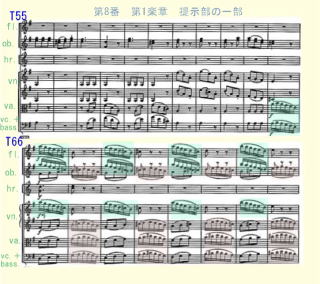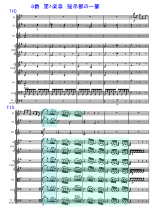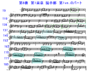 2016年12月24日 T ピノック No.8を聴取。第1楽章のT1の第1主題8分音符の切れ目のあるリズムに対してT66の第2主題の16分音符の下降する流れの旋律の対比がポイント。最近聴いた 佐藤のモダン楽器で流れるようにビブラートが少し聴いた重厚な旋律が印象的だったことと対照的な音色。No.6にも少し記載したが、古楽器で奏者がやや少ない編成のために、T66からのTuittiの下降旋律の迫力が不足。 |