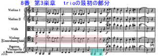 3曲セットの最後の曲。No.7から引き続くと、調性がまた変わる。第3楽章 Menuetto のTrioは、3曲とも共通することの一つとしてbass.とfg.のsoloが入る。No.6の時は、bass.の位置は、左側にあるものの、余りよく分からなかった。No.6はva.のsoloもあるので、va.の音源との兼ね合いもあるのか?