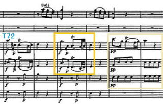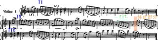 この楽章は得てしてTuittiで駆け抜けるように終わり、各パートの独自の動きが少ない箇所が多い。しかし展開部の後半T76で提示部の動機が、ppで第1vn.が登場する。第2vn. va.もpで添える。この強弱の対比が印象的。