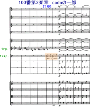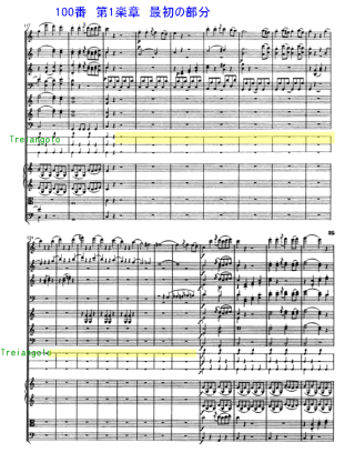 2016年8月12日 ブリュッヘンOrchestra of The Age of Enlightenment No100を聴取。第2楽章の打楽器群は、ハイドンの交響曲の中で唯一登場する楽器。打楽器群は、他のパートに比べてかなり目立つように演奏される。中央のtimp.を除いてだがっきぐんは、左側に位置。シンバルとトライアングルの位置も少し離れていて、これらの楽器の分離感が良く分かる。T141からのpの部分になるが、ここでも、各弦のパートはpの指定を忠実に守り、p指定の打楽器群の音を目出せている。トライアングルが少し独自の動きをしているのも良く捉えている。 |