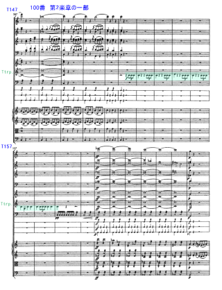 演奏のスタイルはNo.101と同様。各パートの音が比較的明瞭。第2楽章の追加の打楽器群は右側に位置。Trp.は追加の打楽器群でないためか左側に位置。