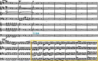 展開部の中間当たりのT169当たり。冒頭から低弦のvc.とbassの分離は随所にあるが。この箇所では、少し前からvc.が高い音域で入ってくる。そのわずか2小節後のT171で低弦がTuittiで演奏する。音の高低差と唸るようなbass.の厚みの差が印象的。