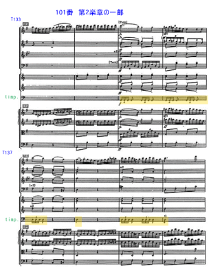 2024年7月16日 101番 室内楽版 コンバティメント・コンソート・アムステルダム を聴取。No.100から引き続く。No.100は、打楽器群が入るが、従来よりも追加でのシンバルなどの追加の打楽器が入る。しかしこちらの方はtimp.とtrp.のみ。No.100の第2楽章はtrp.のファンファーレの部分は、vn.が担った。一方、No.101の第2楽章 T135の部分。フルオケの部分では timp.が急に入り目立つ部分。この演奏ではtimp.の部分は休んでいるため、柔らかい雰囲気。