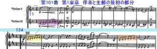 ところでこの第1楽章の序奏の部分。CDのライナーノートや名曲解説全集などでこの序奏について、主題との関連性は、余り記述されなかったと思う。短調と長調の調性やテンポも異なる。しかし最近、私が思うに冒頭の序奏の動機。第2vn.が上行していく4分音符の動機と第1vn.のT24 第1主題の一部。共通している部分がある。この楽章は、No.102と同様にあらゆる動機が練達のように登場、展開されている。メインの第1主題の動機は、すでに冒頭の序奏から暗示していると思う。これは、No.101にとどまらず、No.102やNo104にも共通していると思うが。