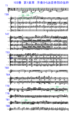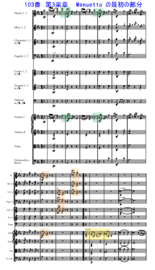 古典派の様式の中で第3楽章 Menuetto の主部の中でNo.103が掲載されている。この中で木管と弦楽器の楽器の音色の対比に関して、ハイドンの工夫としT8からの部分。スコアを見ると T8の部分は第1vn.+fl。同じ動機でT9 でhr.+fg. +第2cl.。 T9 fl.+ob.+第1cl. 。同著には記載されていないが T8〜T10の動機は T2の動機の変形ではないか?