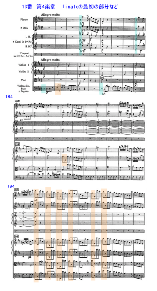ソナタ形式の第1楽章は、展開部も聴き所のひとつになる。それに対してFinaleはソナタ形式であっても比較的長さも短く、軽快な雰囲気で終わることも多い。それに対してNo.13は比較的短いながらも、展開部はかなりの聴き所となっている。T2の8分音符の下降する動機はT94から音域を変えて何度も変えながら登場する。短いながらも細かい所までが聴き所になっている交響曲の一つと感じる箇所の例。アントニーニの演奏はtuittiのユニゾンの箇所でも各パートの動きはよくわかる。