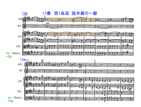 2024年2月16日 13番 J クランプ Johanees klumpp Heidelberger Sinfoniker を聴取。4枚組の最初の1枚目(第28集)の最後になる。過去のNo.13のレビューに関しては、Finaleのfugue 主題がモーツァルトのNo.41のFinale類似している記載をした。「ハイドン106の交響曲を聴く」でも同様だ。ライナーノートの(指揮者自身の執筆)も同様。今回、このライナーノートの中でNo.12との関連の記載があった。一つ前のNo.12の第1楽章の部分で、 0:22秒頃の部分でモーツァルトに関連したfugueのヒントがある。この箇所は下記の譜例の部分だが、恐らくこの全音符旋律だと思う箇所。この箇所は推移的あるいは経過的部分であるような感じ。冒頭の第1主題がどうしても印象に残っているので、余りこの箇所には気が付かない。低弦は4分音符の旋律が続くこともありさらに目立たない。私には過去まで気づかなかった。No.12との13は同じ時期に作曲されている。同じ頃の作品で主題なりが共通しているのは、この例だけと限らないが。