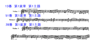 No.13の第1主題はその例として記載がある。1小節の中の短い動機から構成され反復をくり返していく。短い動機から構成される第1主題は、ハイドンの交響曲の特徴一つと思う。録音の多いパリセット以降のこの様な動機は随所にあり知名度は高いと思う。(No.88、 No.103など)パリセット以前にこの様な主題があるかどうか、少し調べてみた。調性こそ違うがNo.51がその一つになると思う。No.13は短い動機が何度も繰り返しながらクレッシェンドに向かっていく。一方、No.51は旋律的な音程や動きはNo.13と少し類似しているかもしれないがT6から雰囲気が大きく変わっているので、やや異なりかもしれない。むしろNo.28の方が当てはまるか?