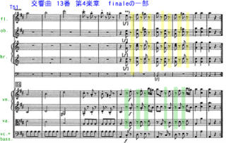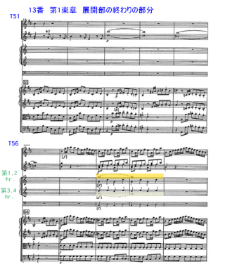 逆に4名の奏者がユニゾンの場合、元々、hr.は広がる傾向の音とあって、包み込むようになっている。他の木管楽器と異なりある意味、包み込む音の特徴を生かしているが。元々No.13は、初期の交響曲の中でコンパクトながらも、聴き所が多い曲のひとつと記載をしてきた。 J クランプ のレビューにも触れているが。第1楽章のやや長い展開部で、短く転調をくり返す変化は「交響曲の生涯」でも掲載されている。