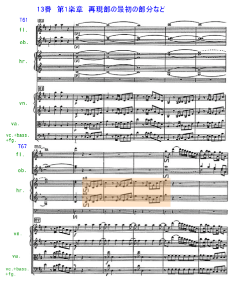 No.13はNo.31、No.72の頃と同じ時期に作曲され4人のhr.が入る。No.13のレビューで4名のhr.の奏者の配置や効果について記載をしてきた。たとえば J クランプの場合 第1楽章で再現部のT62の部分。 4名のhr.奏者が一斉にユニゾンで活躍する箇所。クランプの場合は 以外にもhr.が目立たない。