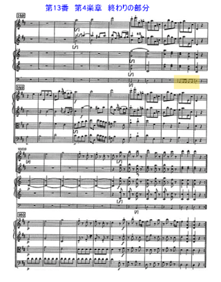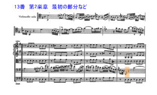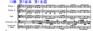 今回は、この中の③について書いてみる。第1曲目のNo.16は、第2楽章に独奏のvc.がある。管楽器が入らないのはNo.16と共通点。No.16は、伴奏側は全て弱音器を付けている。それに対して、No.13は伴奏側の弦のパートは弱音器を付けていない。No.16を最初の収録に対して、No.13は1枚目の最後。No.16とは異なる特徴がポイントとなる。