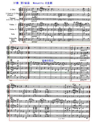 を含む4楽章は余りないが。その内の一つNo.37の部分と比較をしてみた。No.37は2番目に位置しているが。No.37の第1部は同じ10小節だが、第2部は14小節。全体の長さはNo.13と比較して短い。No.37の第1部は同じ小節数でも音量の差が特にない。それに対してNo.13の方は、音量の差がある。弱奏の部分でもエコーの様な描写にも聞こえる。この点だけをとっても、充実した