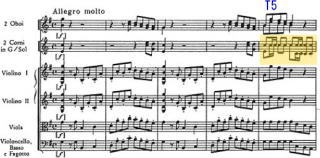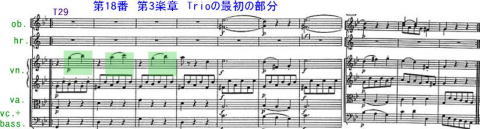 第3楽章のTrio(中間部)の部分。この曲で殆ど唯一といっての短調。付点の旋律が消えて弱奏で変わる箇所。繰り返しがあるのは通常通り。繰り返しでは第1vn.はわずかだが、ポルタティメントあるいはグリッサンドのように引いている。8分音符の刻むような第2vn.の音色とも対比されて曲想の雰囲気が「がらり」と変わるのも効果的。