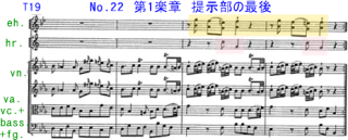 Eh.は冒頭からもうひとつの管楽器のhr.と対等のような扱い。hr.とeh.はそれぞれ左右に、やや広がって左右対称になるような位置づけ。第1楽章は、低弦、特にbasss.は、殆ど4分音符で、分散動機の様な役割。No.13は4人hr.ではあるが、必要な箇所では敢えてhr.を目立たせる可能性を指摘した。しかし実際には、特にhr.の目立った扱いはなし。それに対してNo.22の方は、特に第1楽章でhr.を含めて管楽器がかなり活躍。冒頭から主旋律が管楽器になること。hr.は、速いテンポや短い動機の演奏は困難なことから、旋律としての表現に制限があること。楽章全体の大半、弦楽器と菅楽器を常に対比さえようとしていること。管楽器と弦楽器が合わさる、いわゆるtuittiの箇所は、最後しかないこと。このような状況からも、菅楽器が独自に振る舞っている特徴がある。このため、菅楽器の音量は通常よりも、大きく扱っている理由があると考える。2つのvn.は弱音器を付けているので、なおさら、菅楽器の音色が引きたつのもその要因のひとつ。