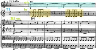 逆に考え方を変えると、元々、響きを生き生きと生かすことが難しい分、音の強弱を中心にアクセントをつける方法もある。冒頭の弱音器とhr.の強弱の対比について、触れられたように、この演奏では最初は冒頭から hr. が盛大に活躍する。しかし冒頭のみ この ff を生かしているようだ。展開部の一部でhr.は少し音量を上げるが、冒頭ほど活躍しない。終始、vn.は弱音器を付けているので、強弱の調性も難しい。その分、管楽器に強弱の役割が高くなる。hr.はもとより、eh も強弱をうまく、つけていると思った。例えば、T19から提示部の終わりにかけて。弦楽器は音量を抑えることが難しいなか、管楽器のhr.と eh は音量を、冒頭と異なり大きく抑えているのは印象的。
