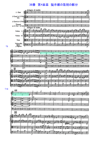 Finaleの冒頭。この主題はNo.22のFianleの冒頭にも似ていると思うような下降旋律。(参考までに2つの主題を並べてみた) 調性と拍子は違うが休止を挟む下降する雰囲気は似ている。しかしNo.38の方は、T1からスタッカートの指示がある。その後スラーがあるなど僅か2小節の中でも微妙な違いがある。