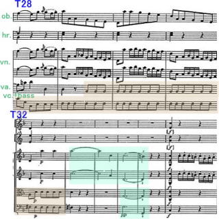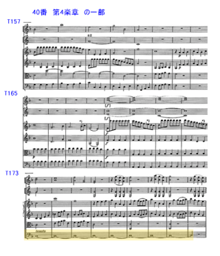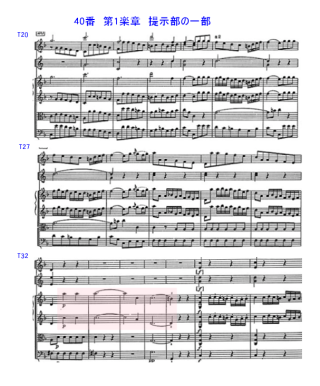 それに対して、No.40は比較的後にされたのか、冒頭の主題は比較的長く続いた後、T32で弱奏でテンポを落とす。この箇所は低弦の休みになる。低弦の休む箇所はわずか4小節しかない。その後低弦は、冒頭と同じように元気よく戻り提示部を締めくくる。4小節の弱奏の部分をどのように演奏するかが、ある意味、聴き所の一つだと思っていた。
