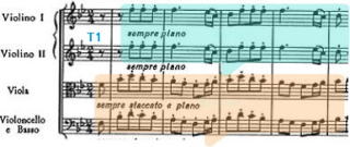 この楽章は2つのvn.が同じ音程のユニゾン。vn.以下の低弦は、オクターブ離れてユニゾンで対比をさせている。vn.と他の弦との対比が需要になる。対向配置でないことを逆に生かして、va.以下の低弦も均等に引き立てたる。冒頭から第1楽章と同様に、4分音符の対旋律の様に低弦がvn.と対等に聴こえているのが印象的。