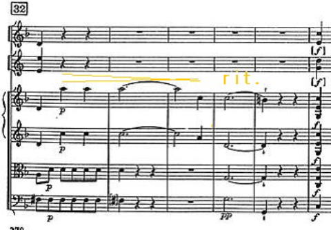 ブリュールの場合は、これに対して、各パートはメルツェンドルファーと同様に均等になっている。第1vn.の冒頭の動機は、やや控えてめで柔らかく演奏。T ファイの様な、強烈な上昇していく雰囲気は皆無。楽章全体を通して、8分音符の動機は、殆どの箇所で支配をしている。第1vn.の冒頭の主題が、柔らかい分、8分音符の刻む様な緊張感が、前面に押し出さされている雰囲気。8分音符の動機は、この楽章で大半が活躍する。しかし提示部と再現部のごく一部の箇所で、この動機が休み静まる箇所がある。T32からの部分になる。ここでは8分音符の動機は全て休み、スラーの短い休止期間に相当する。冒頭から忙しかった雰囲気が一瞬ではあるが途切れる。この対比が印象的。