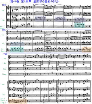 第1楽章の冒頭から、やはりob.が前面に出ていて弦楽器が目立ち難い。特に、この第1楽章はかなり目立つ方だと思う。Finaleでは3連符を含む無窮動の動機が大きい。しかしそれ以外にもスラーを伴う対旋律など、結構、色々な旋律がいたる所にある。提示部のT8の部分では、3連符の動機は2つのvn.以外が受け持っていた。展開部の類似箇所のT82で管楽器のob.と低弦のみが3連符の動機を演奏する。一方2つのvn.は音程を変えて、対立する箇所がある。この部分での緊張感が欲しいが、やはりob.が目立ってしまう。以前No.25の第1楽章の展開部でも似たようなコメントを記載した。それと同じ雰囲気。
