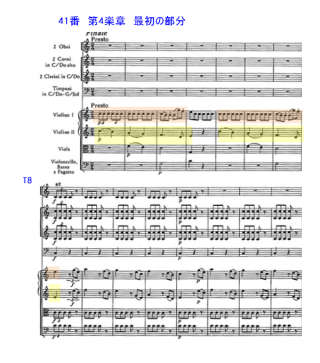 2016年12月31日T ピノック No.41を聴取。Finaleの無窮動的な旋律に対して、第2vn.の下降する対旋律も聴き所の一つ。対旋律は展開部でも取り上げているので大切なもの。再現部のT93では、第1vn.から登場。このT93の部分では、第2vn.が逆に、4分音符が登場するがピノック盤では明確(上手参照)ただし、ゴバーマン盤と同様に第2vn.の旋律が明白に聞こえるがTuittiでの迫力はNo.35と同様に今ひとつ。