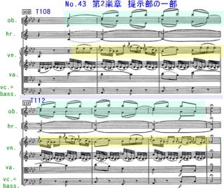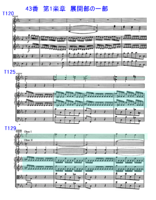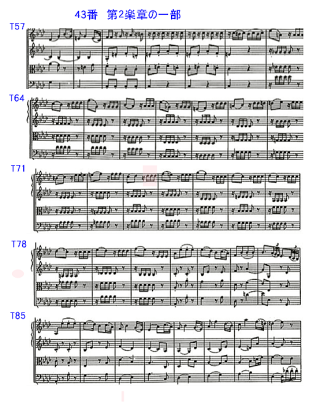 この当たりの類似箇所の例で、No.45の第1楽章の冒頭の主題にも記載がある。こちらの方は、どのフレーズも長さと形が同じ。繰り返しやバロック風の反復進行に頼っているなどの記述もある。No.45とNo.43との冒頭からその後の推移あるいは経過部などを比較してみると、これら2曲は明らかに対照的なのは私でもよくわかる。