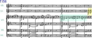 最近は古楽器で奏者の少ない演奏を聴く機会が多かったのとは対照的。冒頭からhr.はあくまで和音で支えるだけ。はぐらかせるような再現部の手前を経てT162で冒頭の主題が再度、登場する。この部分でもhr.が僅かにsoloで入っているが、あくまで控えめ。