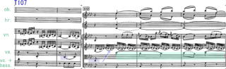 また、低弦の開放弦の音もよく分かる。例えば再現部のT108からの部分。va.は一番低い音域からT109の高い音域へジャンプする。vn.は対向配置だが、ba.は左側の奥側に位置する。しかしva.の音もよく分かる。