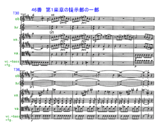 2023年10月29日 46番 R グッドマン ハノーヴァバンド Roy Goodman The Hanover band を聴取。No.45から引き続く。No.45にも管楽器のパートの目立つ動きをレビューした。このNo.46も同様。ロ長調という当時はめったに書かれていない調性。第1楽章の提示部でロ短調になる部分がある。T36からの部分で、第2vn.はシンコペーションの旋律が登場する。2名のhr.の位置もよくわかる。
