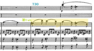 展開部の途中でT29当たりから第1vn.が謡うように高音域で演奏する。ここでは第2vn.以下のパートは目立たせない。T31で2本のob.が入ってくると第1vn.はob.に受け渡して控えに回る。16分音符の動機は最初からいたる所にあるが、低弦でも柔らかく演奏。