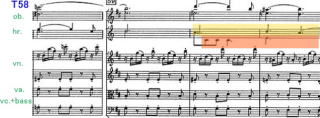 演奏の方は冒頭から、古楽器をいかした切れの良いアクサ縁とろリズム感は同様、pの箇所も、マリナーの様に、pの弱い音量の中で、各パートも良くわかる。「通好み」の作品と記載したが、パートに関しても、2本のhr.は、2つに分かれている箇所なども第2hr.(低音の方)も鮮明に聴こえる。(第2楽章 再現部T60の部分の譜面あり)