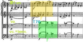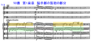 2017年2月15日 T.ファイ No.50を聴取。3曲目から打楽器群が入る。第1楽章のピノック盤 T39からの個所でも少し触れた個所。ピノックではva.16分音符が目立つことを取り上げた。ファイ盤ではこの部分は余り目立たず。もう少し後の、T39からの経過部の動機。第2主題に向けての属調を確保して行く部分。Vn.パートは、切れのある「きびきび」とした雰囲気が多い。ファイの演奏は、この部分からスラーで演奏をする。T52からのスラーを伴う第2主題へつなげるための、橋渡しの解釈かもしれない。