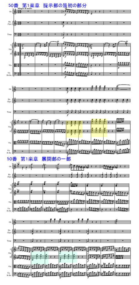 No.50は、どちらかといえば余り注目されない曲の一つかもしれない。従来までNo.48とされていた曲と同じ調性。No.48と比較すると打楽器群は入るものの、派手な印象が余りない雰囲気かもしれない。しかし各楽章はそれぞれバランスが取れているように私は思う。たとえば第1楽章は序奏を伴い、速いテンポで常に流れるように書かれている。第1主題は流れるような旋律に見えるが、伴奏側となる第2vn.は常に4分音符の連続となっている。提示部の終わりに近い部分の第2主題も、第2vn.は4分音符となっている。流れるように感じる雰囲気が終始ない。