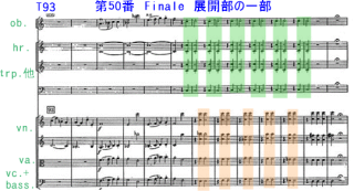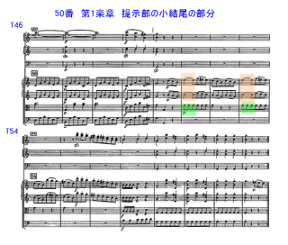 Finaleの展開部のT98からの部分。提示部からこれまでの部分は、対旋律を伴いながらも各パートは大体、同じ出だしで終始をしていた。T98で管楽器と弦楽器が分かれて、休止符を挟みながら掛け合う箇所。突如、短いながらも緊張感が増している箇所。単に聞き流してしまうと一挙に終わってしまい違いも余り分かり難い。しかし様々な奏者でスコアを見ながら聞いてみると、意外なところで仕掛けが楽しめる。この演奏でも弦と菅とが分かれていて興味深い。50番 ロイ・グッドマン ハノーヴァー・バンド