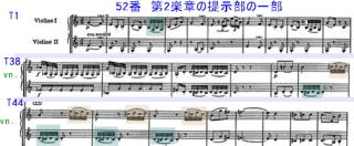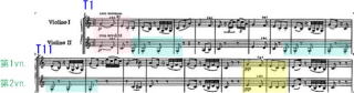第2楽章ではT3で出てくる旋律が終始、全体を支配する。主に第1vn.が受け持つがT100の部分の様に、微妙に掛け合う部分が聴き所。