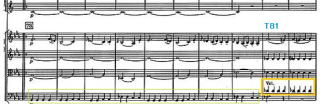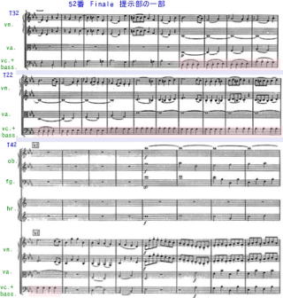 Finale 提示部の途中のT28からの部分。スコアでは低弦は4分音符の記載になっている。過去の指揮者も、この指示を守り、第2vn. va.の旋律と対比させていた。ところがこの演奏では、低弦は4分音符の指定ではなく持続音に近い。音量も落としている。T46からのtuittiの部分と対照的。