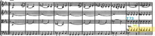 Finaleの再現部 T156からの部分。第1楽章と同様にFinaleの最後も主調のc-molの短調で締めくくる。これに至るまで弦楽器は低音の箇所が多い。第2楽章での第2vn.の最低音を記載した。T156はフェルマータの休止から最後の締めくくりに向かっていく。ここでは管楽器はhr.のみだが第2vn.は、やはり最低音域の持続音。T164からva.も最低音の持続音。この当たりは、最低音の効果をうまく演奏していると思う。