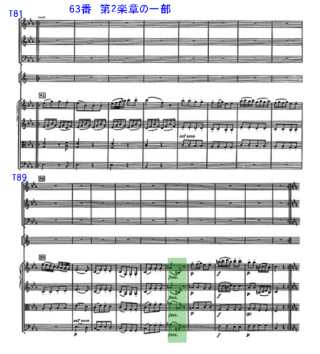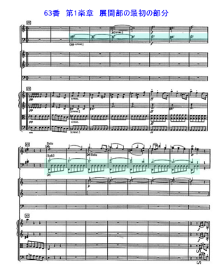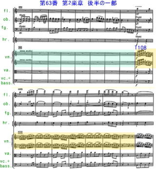 その後No.55でも、緩叙楽章は、No.55にも少し記載をしたが、聴衆への迎合が少しずつ入ってきた雰囲気。このNo.63ではNo.53と同様に、余り大きな転調や曲想の変化、各パートでの独自の動きなどが少なくなっている。迎合のための分かりやすさが前面に出てきているのが良く分かる曲のひとつ。 |