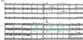第2楽章の終わりの方で、T99から第1、2 vn.弱音器を外す。その後の音色とともに強弱の対比も効果的。N マリナー 盤では、T99で弱音器を外す音が入っていた。こちらの方は、余り聞こえてこない。アントニーニの演奏は、弱音器使用の有無で音量の差は、マリナーほど大きくはない。録音によるかもしれないが、弱音器をつけても、そこそこ音量は大きいようだ。
