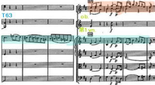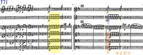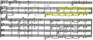 また管楽器の中で必要に応じて、特にhr.を強調させるケースも多い。第2楽章の冒頭は弦楽器のみの演奏。途中から管楽器が加わる。hr.は最後に低音域でbass.と一緒に終わるなど重要な役割を持っていると思う。T78では4部休符を挟んで弦が加わる部分がある。T78の最初は、逆にhr.が出だしから強調して加わっている箇所。この部分一つをとっても、hr.の音色が効果的に表現していると思った。