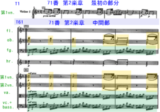 さて、この第1楽章は様々な動機が登場するが、No.83にも少し雰囲気が似ていると思う。すなわちNo.83は序奏こそないが様々な動機が登場し、展開部で生かされていること。No.71も同様に第1楽章の提示部で様々な動機が登場する。T53からの第2主題の経過動機?でva.→第2vn.→第1vn.に移行していく部分。再現部のT180からはvc.→va.→第2vn.→第1vn. と順番と調性を変えている。