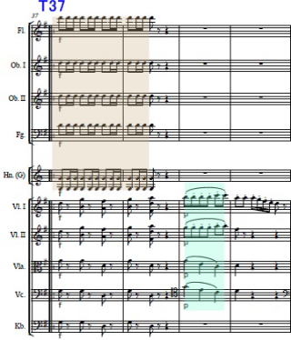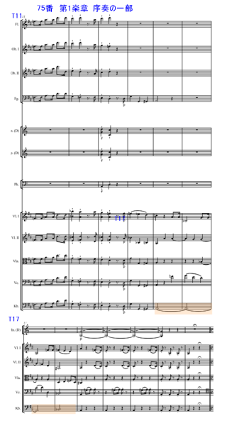 No.75の第1楽章の序奏は、恐らくハイドンの交響曲では最も遅いテンポの Glave。序奏の後に、提示部、展開部、再現部は繰り返しになっているが、この序奏は繰り返しがないので、注意深く聴取する必要がある。 T15からのvc.とbass.の分離も、右側の低弦がそれぞれ分かれて配置されている。bass.の持続音がよくわかる。ライナーノートの写真を見ても、中央のやや右側のvc.の間に第1vn.の奏者が1名、間に入っている。ただし、ライナーノートの写真は、vn.の各奏者が5名。ヴァンハルとハイドンは各4名の演奏だったので、この間の奏者がいなかった可能性もある。(k504でbass.を除いた1名ずつの追加で入った奏者が、どの位置になるのかは、写真でしかデータがないので分からない。この当たりは、実際に観客として当日、見ることに意義があると思う。どの指揮者にも共通していると思うが、Grave の遅いテンポと 速いPreuto のテンポの対比をどのように演奏するかがポイント。例によって、鈴木の場合も速いテンポとの対比は印象的。