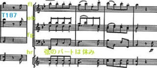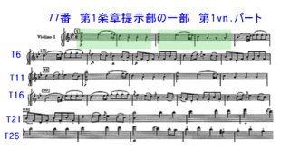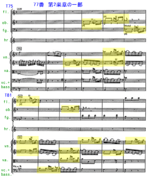 第2楽章はvn.は弱音器を使用。T77からの第2vn.他の各パートの動機。下記のオルフェウスのレビューに譜例あり。ここでも各パートの動きがよくわかる。