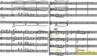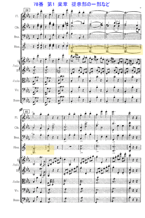 この効果的なコメントは、この交響曲に限らずNo.76-77にもある。No.78にも当てはまる。No.76-77ほど低弦の分離の箇所は余りない。しかし過去の手法と同様に弱音の部分を中心に、vc.の高音域の音色をTuittiとは対比させているのが効果的。Finaleの下記のt96-97の箇所など。