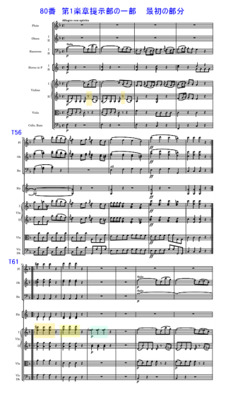 No.76〜78と同様に、No.79〜81も3曲セットでロンドンから出版されているのは共通な所。これまでクランプの特徴の一つとして、レンジの広さから強弱の対比について記載をした。第1楽章は序奏もなく冒頭から第1主題が第1vn.+fg.で登場する。ついつい聞き逃してしまうような旋律だが、第2vn.+va.の対旋律も休符を挟んだ短い動機。スコアをみると冒頭の主題は、T4で一応完結しているが、休符を挟んでいる。休符が適宜至る所に入っていて、聴衆を少し、はぐらかすような雰囲気。前の3曲と同様に短く、分かりやすいように一応作曲者は書いているようだが、少し調べてみると思わぬ仕掛けがあるような第1楽章。聴き所の展開部の最初の部分。小結尾から展開部へ入ってくるとき、半音ずつ上がっていく。その後T63で弱音となり休符となる箇所。音量の対比が効果的。